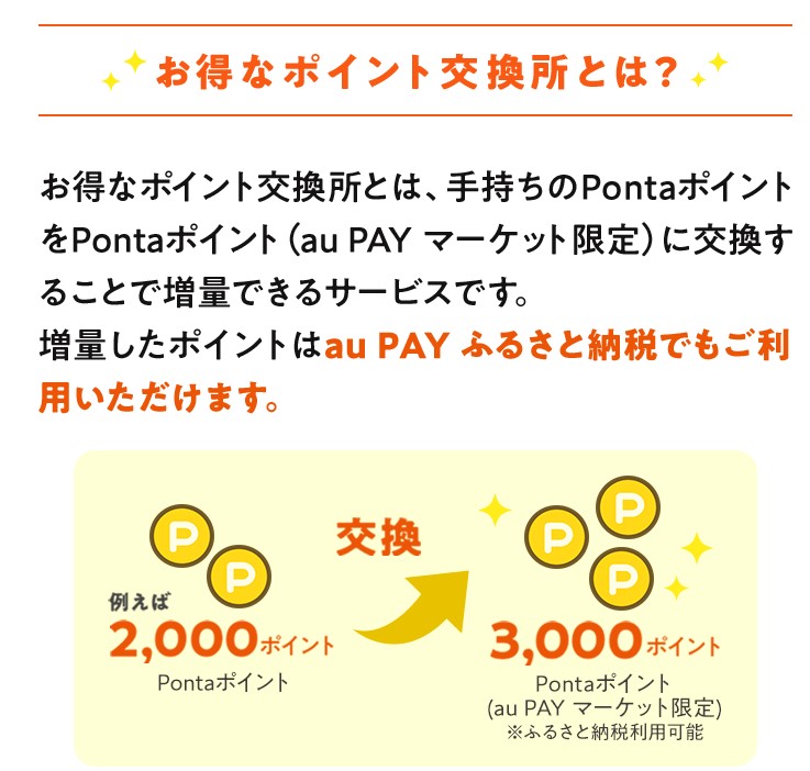つまり、2000Pontaポイントをお得なポイント交換所で3000Pontaポイント(auPayマーケット限定)に変えてふるさと納税で使えば、実質1000円分安くふるさと納税をすることができるんです。