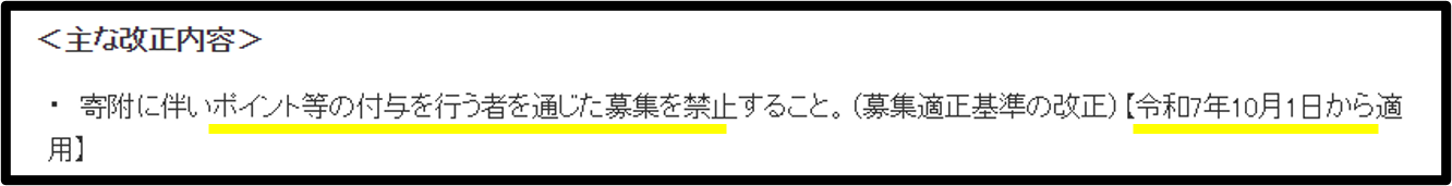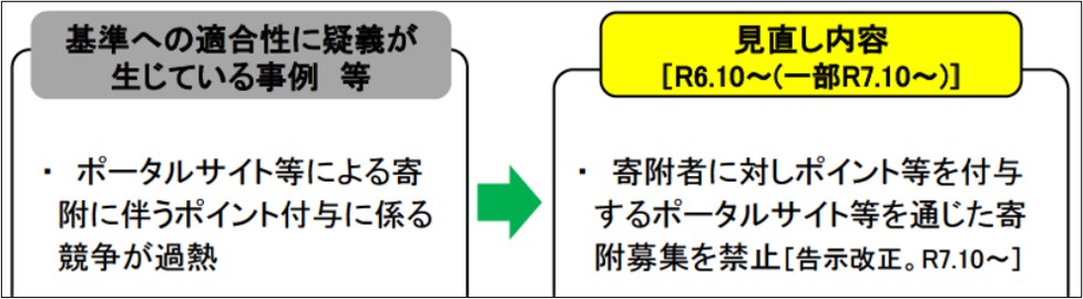 総務省の資料(*1、*2)によると、ポータルサイトによる寄付に伴うポイント付与に係わる競争が過熱していることが、平成31年に公示された以下の基準へ適合していないことが疑われるため、今回の変更に踏み切ったとのことです。