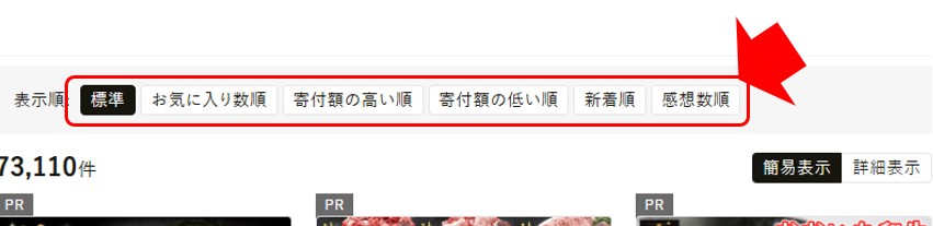 ■(参考)ふるさとチョイスの検索画面(赤矢印の箇所が並び替え方法)