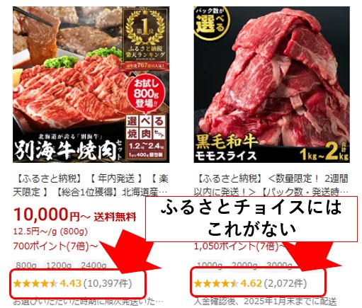 あえて言うなら、口コミの満足度を示す星が表示されないので、『評価の良い返礼品を選びたい』という人にはちょっと使いにくいかと思います。