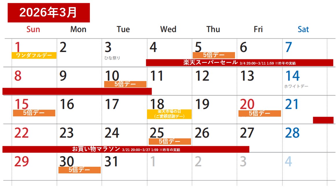 | 3月 | 楽天スーパーセール 楽天お買い物マラソン | 3月4日(土)20:00~3月11日(土)1:59 3月21日(火)20:00~3月28日(火)1:59 |