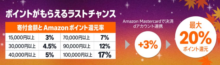 もらえるものがAmazonギフト券ではなくAmazonポイントですが、ポイントアップ条件が寄付額のみなので、非常に利用しやすいのが特徴です。