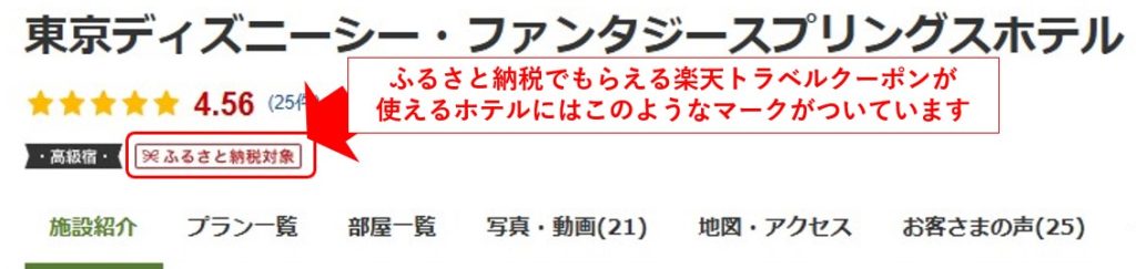 なお、2025年確認時点、ディズニーパートナーホテルでも、全ホテルでふるさと納税でもらえる楽天トラベルクーポンは使えます。